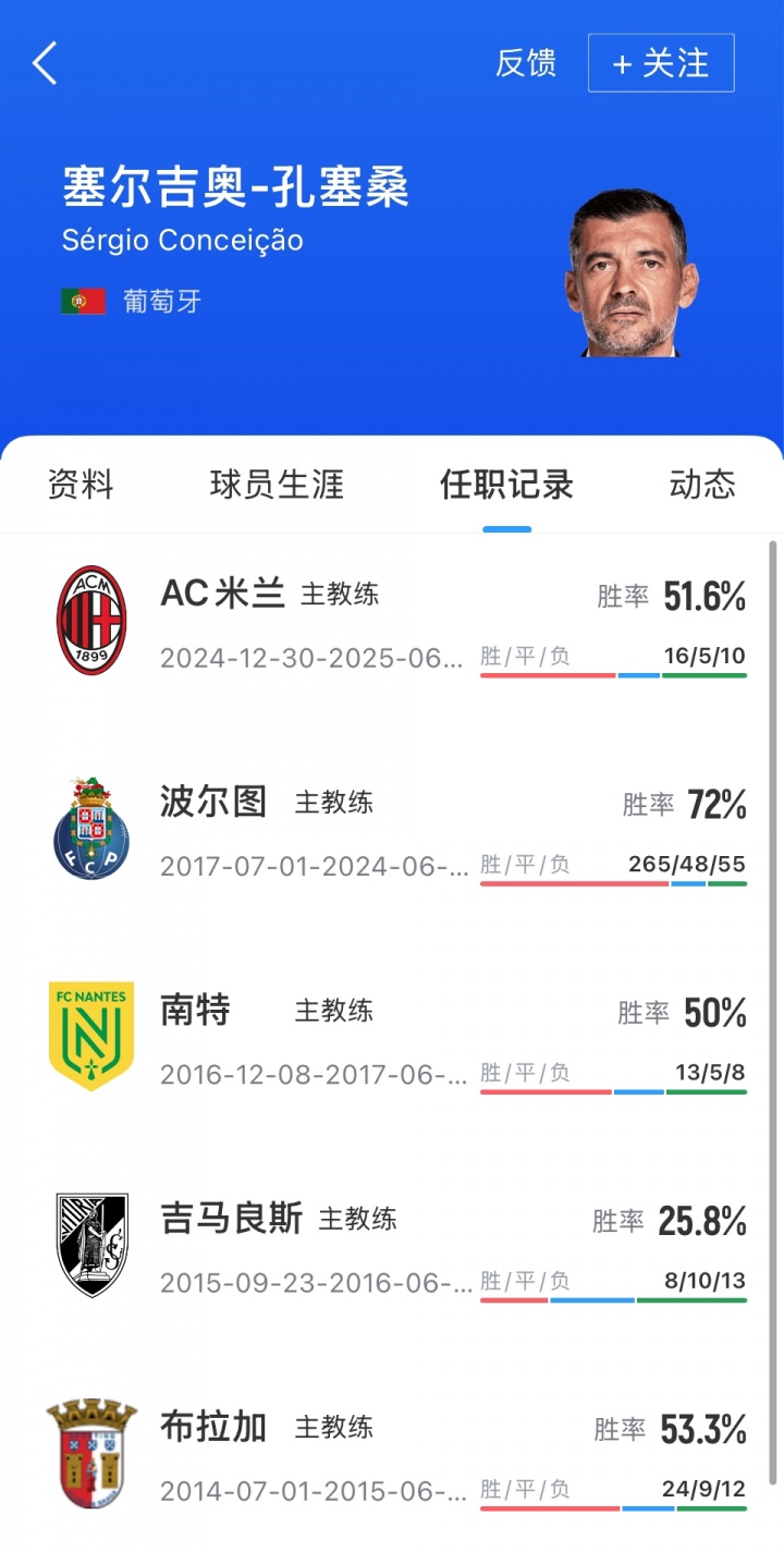 孔塞桑出身于1974年,曾担任波尔图、AC米兰等球队主帅,今夏卸任米兰主帅。