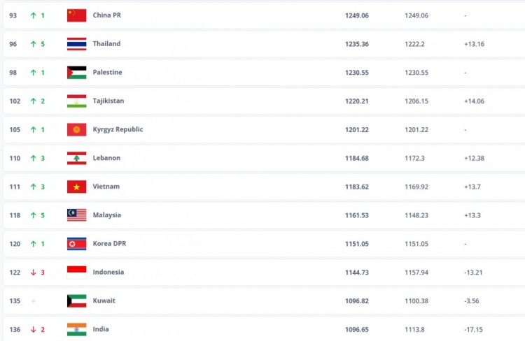 10月17日讯 FIFA更新最新一期国度队名次,亚足联国度队方面,国足积分不变,但名次从宇宙第94位升至宇宙第93位,亚洲名次则已经第14位。