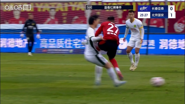 11月01日讯 中超第29轮 长春亚泰vs北京国安。比赛第26分钟,亚泰外助卡米洛踹中江体裁员人腹部,VAR介入认定非红牌。主裁判给了卡米洛黄牌。