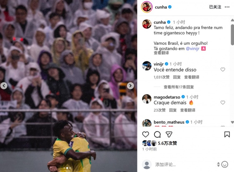 赛后库尼亚也在社媒晒出与维尼修斯庆祝进球的合照,配文写谈:“咱们很是欢乐能与这支伟大的球队无间前进,加油巴西队,咱们为你高傲。与维尼修斯连线破门!”