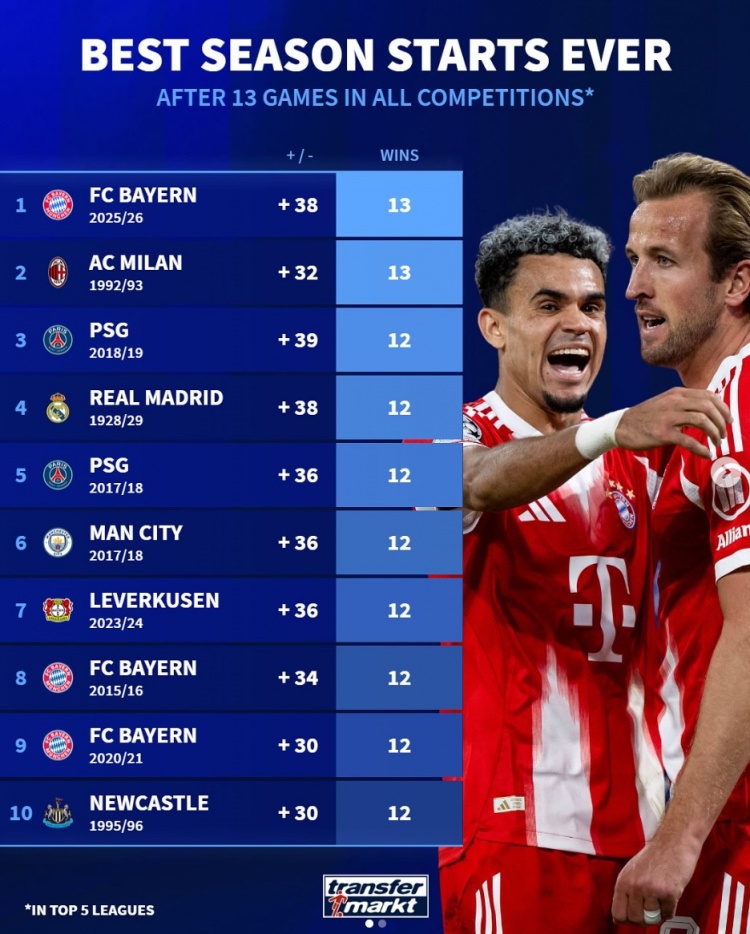 1.拜仁慕尼黑 (2025/26赛季),+38净胜球,13胜