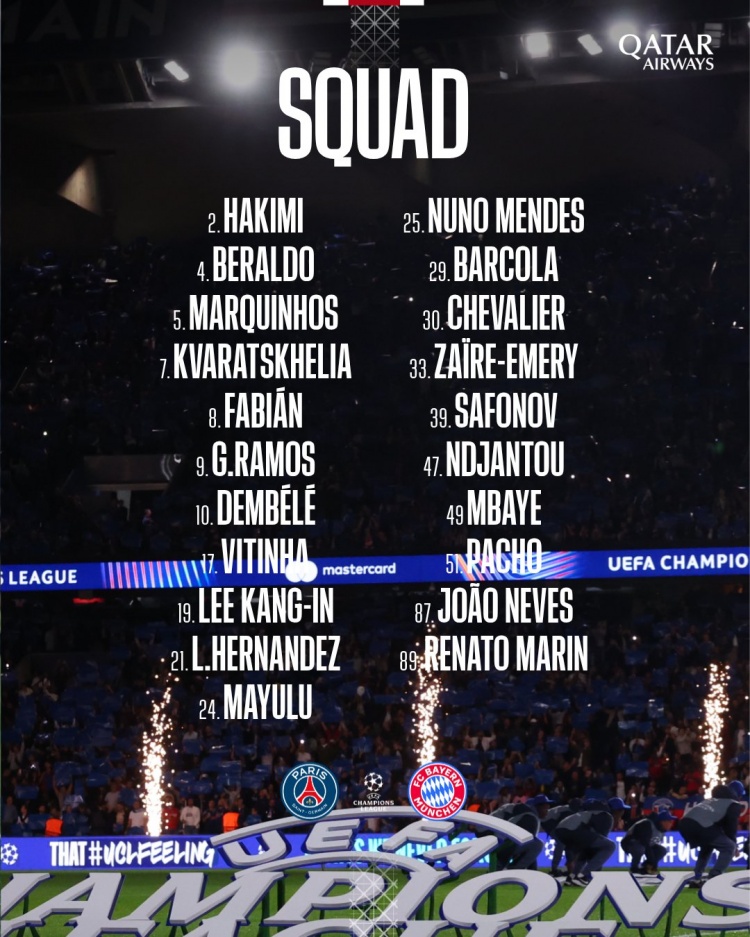 前卫:7-克瓦拉茨赫利亚、9-贡萨洛-拉莫斯、10-登贝莱、19-李刚仁、29-巴尔科拉、47-恩贾恩图、49-姆巴耶