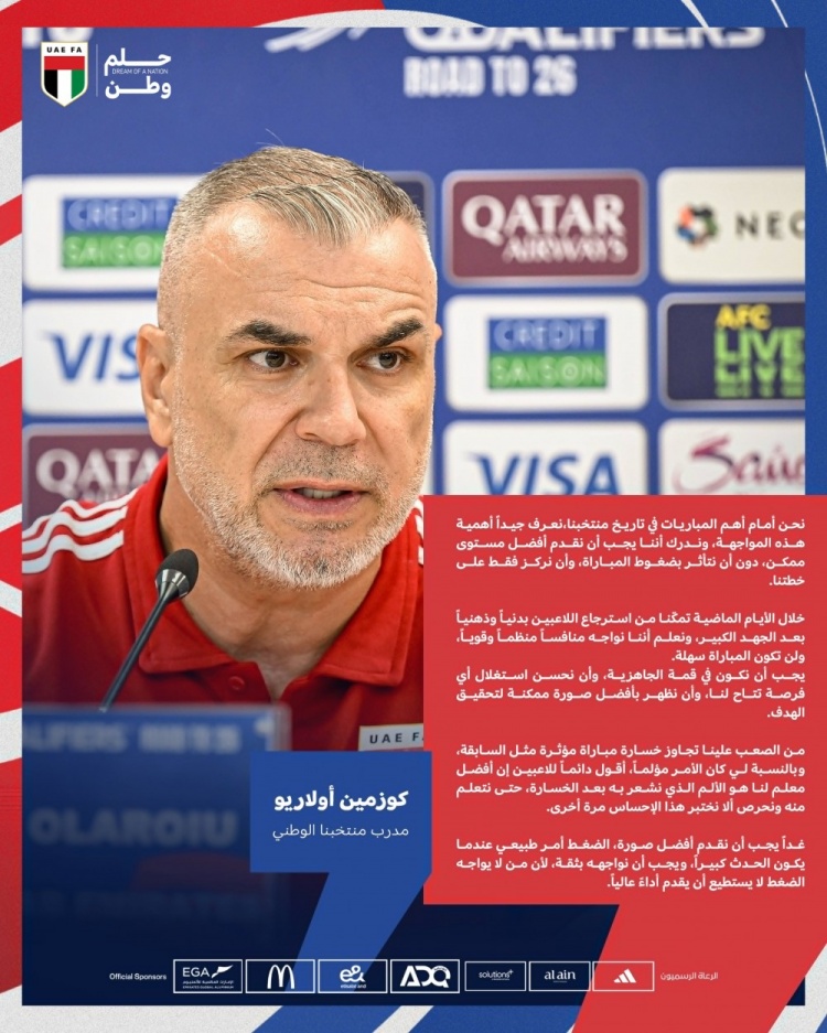 奥拉罗尤说谈:“咱们正濒临着处事糊口中最遑急的一个篇章,亦然阿联酋国度队历史上一个关节时刻,咱们知谈必须要任重道远,管待挑战。