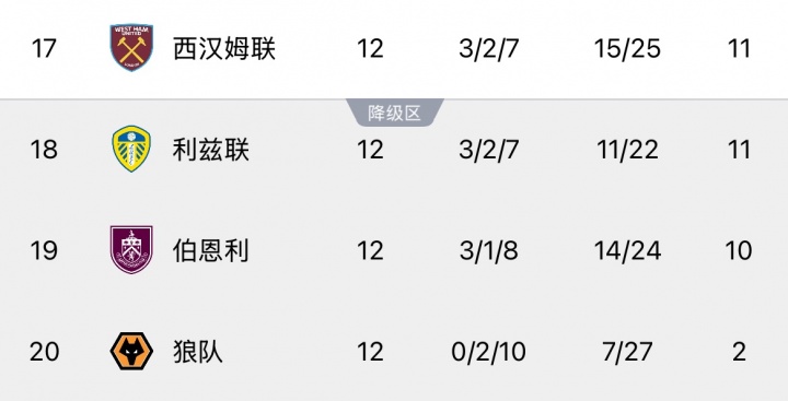 在当今的英超积分榜上,狼队12战2平10负仅积2分,名次垫底。