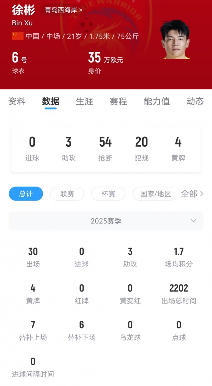 徐彬现年21岁,司职后腰,树立于广州恒大足校,他是恒大足校出品的首位男足国脚,2022年在广州队完成中超首秀,本年1月徐彬解放身加盟青岛西海岸。2025赛季代表青岛西海岸出战30场比赛,其中在中超出战27场,孝顺3次助攻。徐彬在本年曾入选过国足集训名单,但还未干预过比赛大名单。