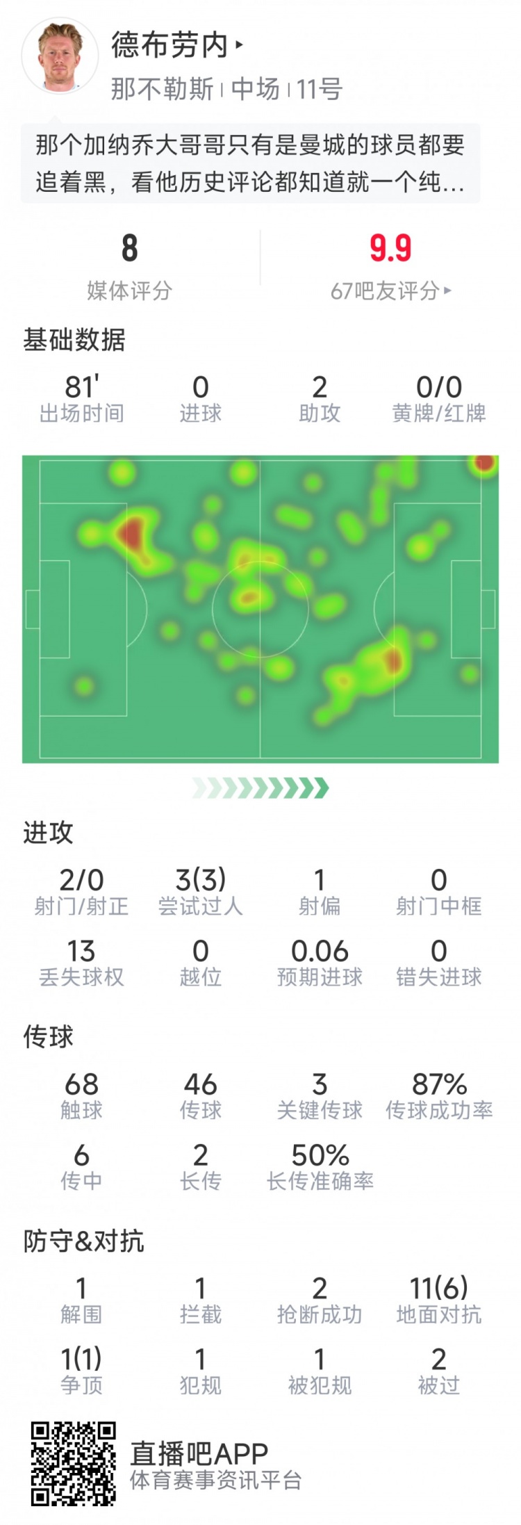 10月2日讯 在本轮欧冠那不勒斯对阵葡萄牙体育的比赛中,德布劳太太攻双响,以下为他在本场数据: