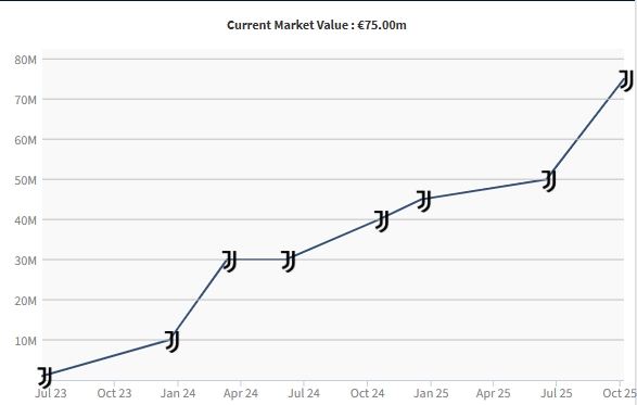 10月07日讯 当天德转更新意甲球员身价,20岁尤文边锋伊尔迪兹身价暴涨2500万,至7500万欧,踏进意甲前三。