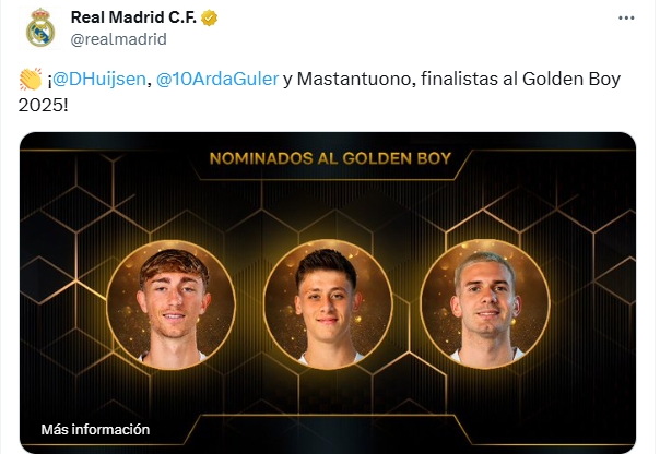 因与《法国足球》关联欠安,皇马此前并未在社媒或官网祝愿入选金球候选的球员,但此次他们在社媒和官网王人祝愿了赫伊森、居莱尔和马斯坦托诺。