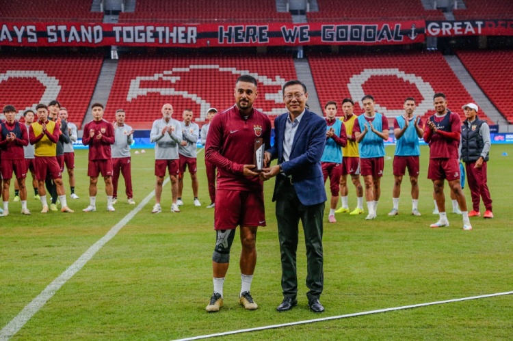 今天的官方磨真金不怕火运行前,俱乐部为两位球员举行授奖庆典。俱乐部总司理沙良昌为莱昂纳多颁发第25轮最好球员奖杯,为李帅赈济百场操心球衣。
