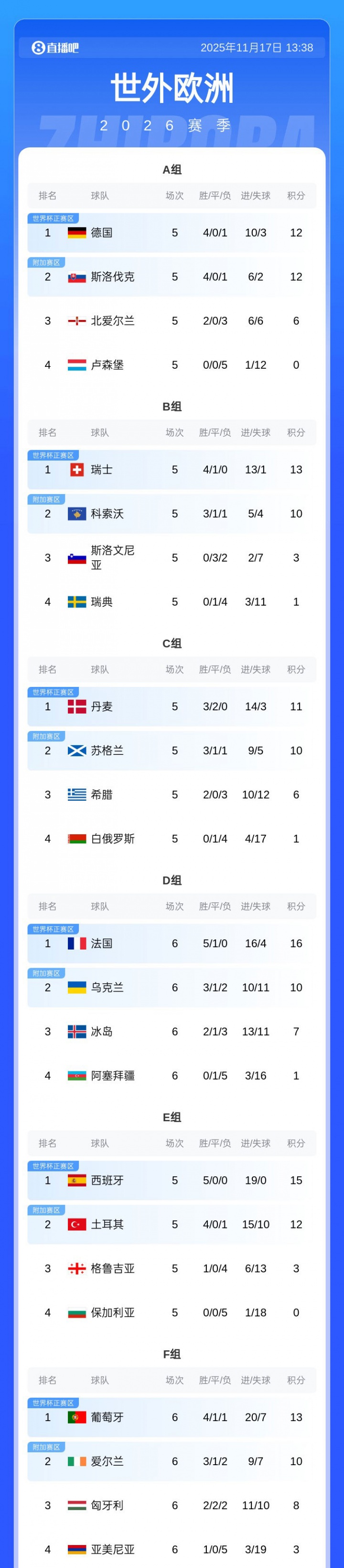 世初赛欧洲区预选赛小组赛行将斥逐,现在16个纵贯限额中,英格兰、法国、克罗地亚、葡萄牙、挪威照旧出线,还有哪些球队有晋级契机?哪些球队参加附加赛?哪些球队照旧出局?让咱们一磋商竟。