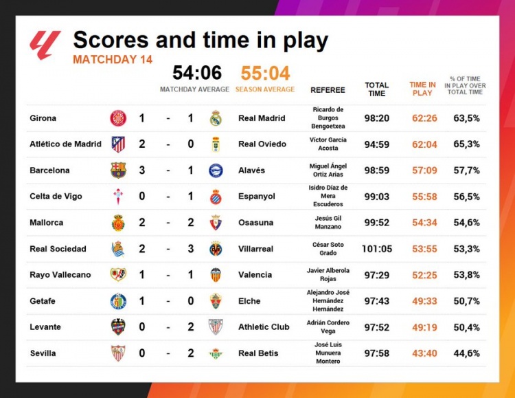 12月2日讯 数据表露,赫罗纳1-1皇马是第14轮西甲净时辰最长的比赛。