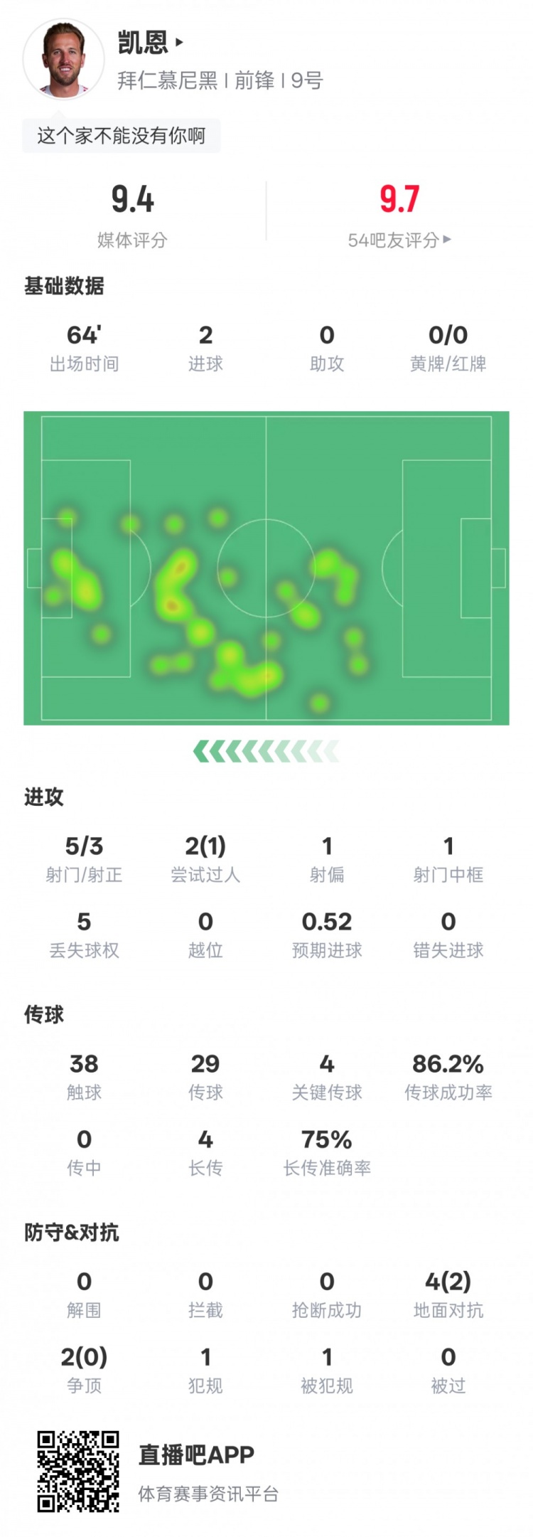 10月1日讯 欧冠联赛阶段第2轮,拜仁对阵帕福斯,凯恩首发出战,孝顺2粒进球,送出4次关键传球,评分9.4。