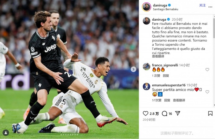 鲁加尼此役为尤文踢满全场,他在外交媒体上晒出比赛相片,配文:“在伯纳乌球场赢得好成果从来皆按捺易,咱们拼尽全力构兵到临了一刻,但仍是不够。”