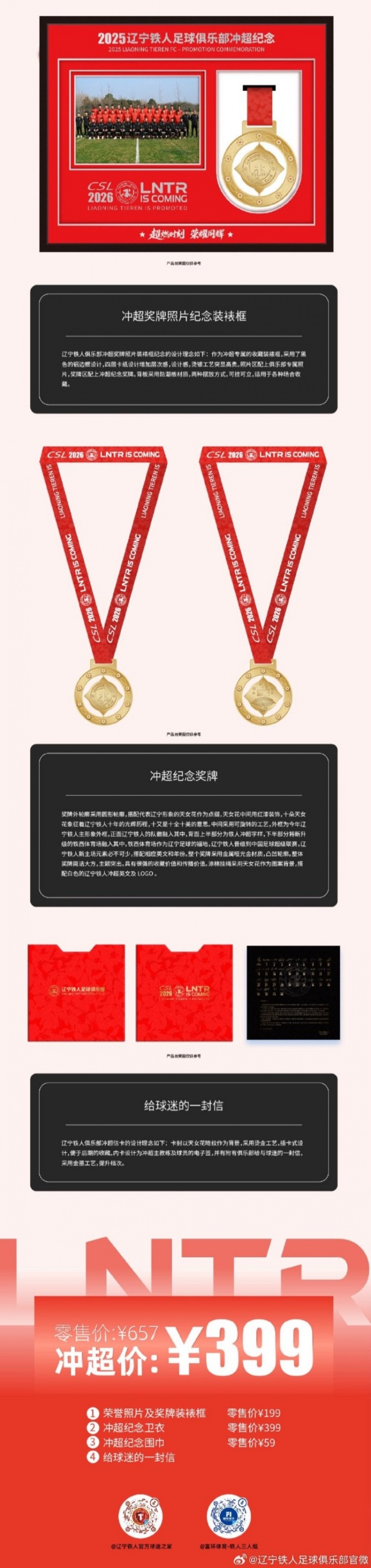 今天,辽宁铁东谈主推出冲超回来礼盒,10月30日14点开售,限量1000盒,零卖价657元,冲超价399元。左证官方信息,冲超回来礼盒包含冲超回来卫衣、冲超回来领巾、冲超奖派司片回来装裱框等物品。