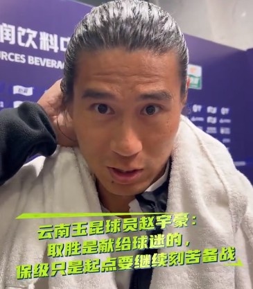 11月3日讯 中超联赛第29轮,云南玉昆主场1-0打败青岛西海岸。在罗致“云南播送电视台”采访时,玉昆球员赵宇豪道到了我方的感受。