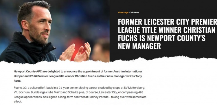 11月21日讯 纽波特郡官方秘书,任命39岁的前莱斯特城英超冠军球员克里斯蒂安·富克斯为新任主老师。
