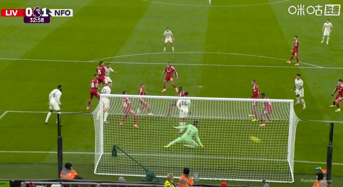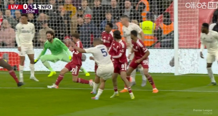 11月22日讯 英超第12轮,利物浦vs诺丁汉丛林,比赛第33分钟,诺丁汉丛林角球契机,穆里略破门。利物浦0-1逾期。但慢镜头显现,处于越位位置的恩多耶疑似侵犯了阿利松的视野。