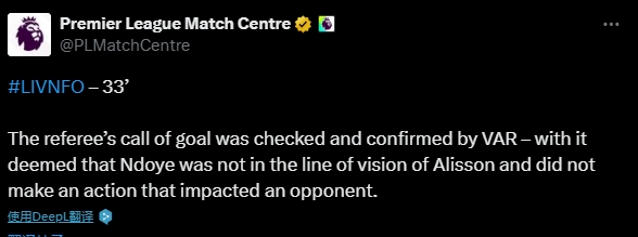 英超官方证明谈:历程VAR查验和证实,恩多耶不在阿利松视野限度之内,也莫得作念出影响敌手的手脚。