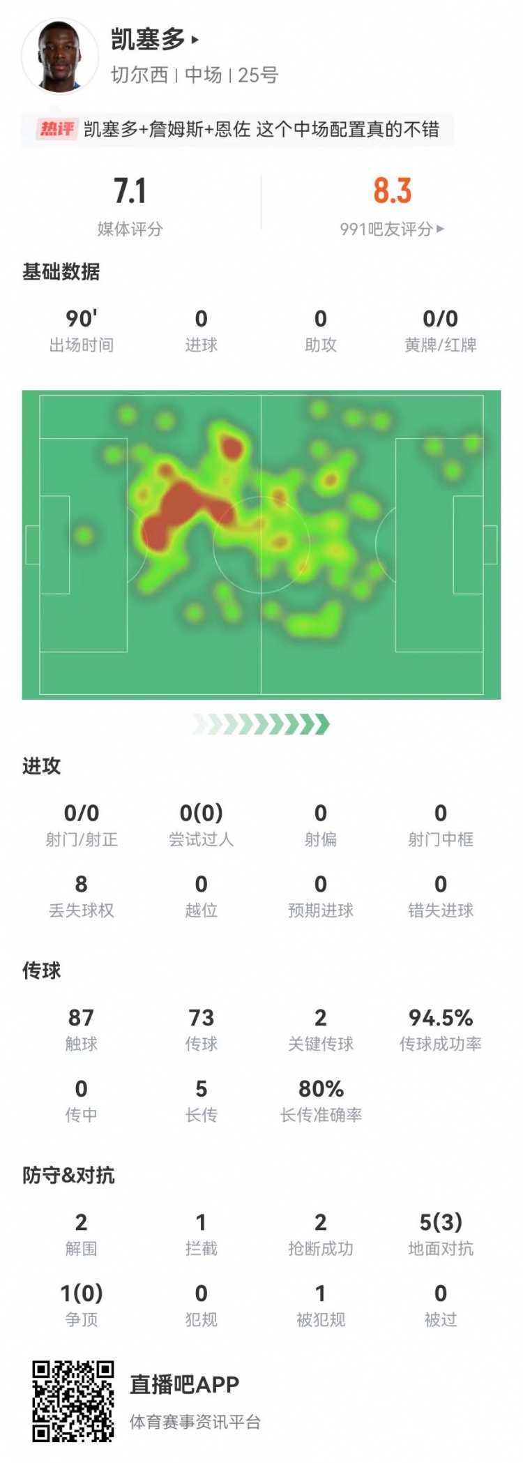 11月26日讯 切尔西在本轮欧冠3-0完胜巴萨,凯塞多本场数据如下: