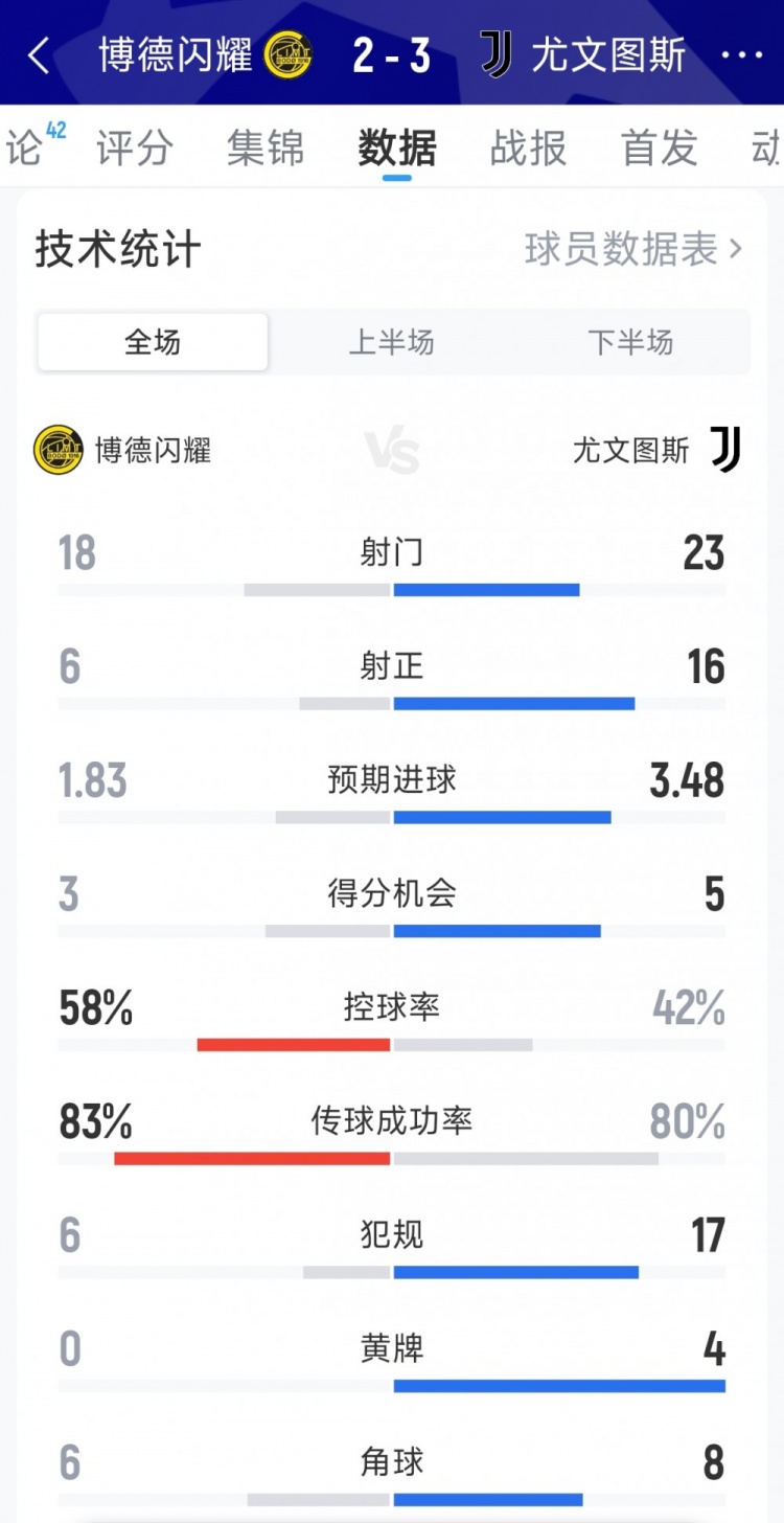 11月26日讯 在本轮欧冠,尤文3-2打败博德精通,以下为两边全场数据对比:
