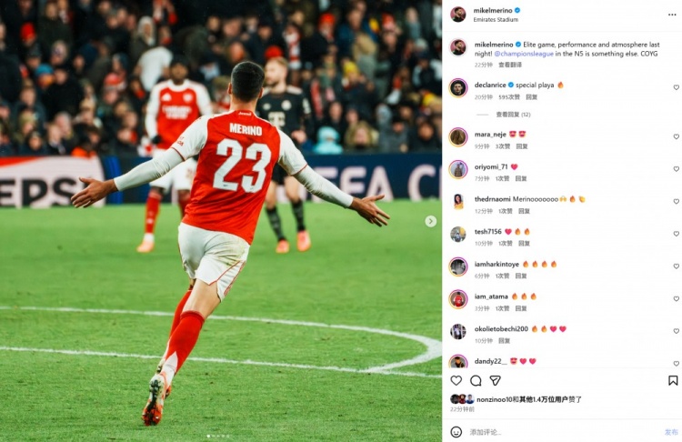 本场比赛梅里诺再次出任中锋,他也在个东谈主社媒晒出本场庆祝像片,配文写谈:“昨晚的比赛质地、球队推崇以及现场沮丧王人太棒了!这第五轮的欧冠一鸣惊人。加油,枪手!”