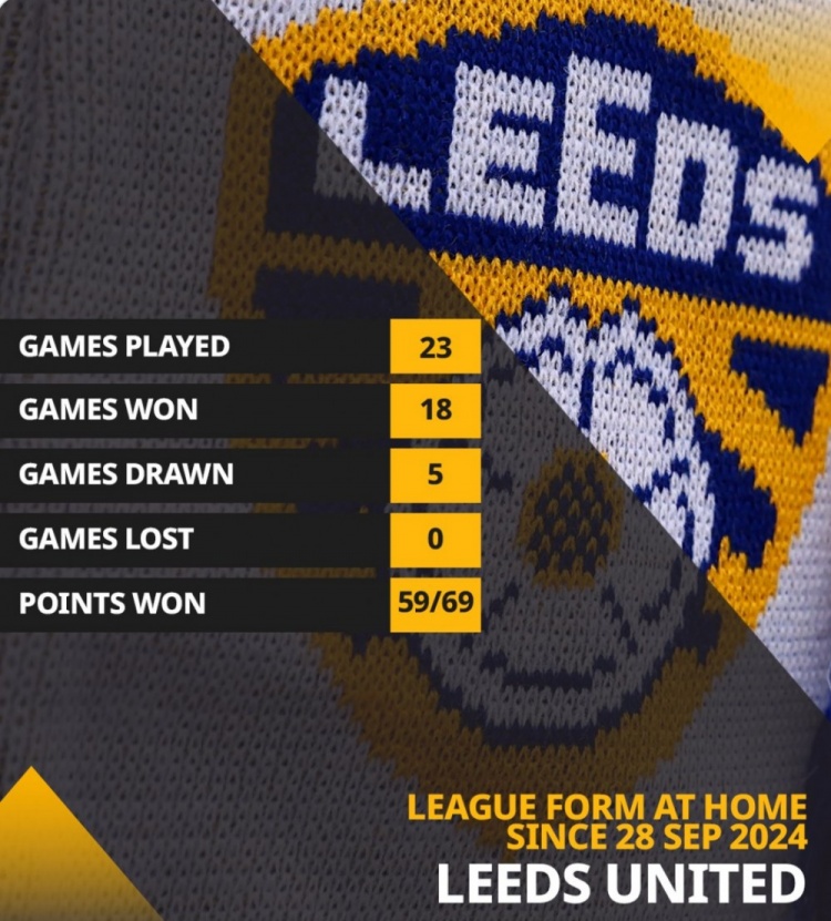 据Opta统计,利兹联上一次在主场输掉联赛是在2024年9月15日,在那之后利兹联23场主场联赛18胜5平,拿到69分中的59分。