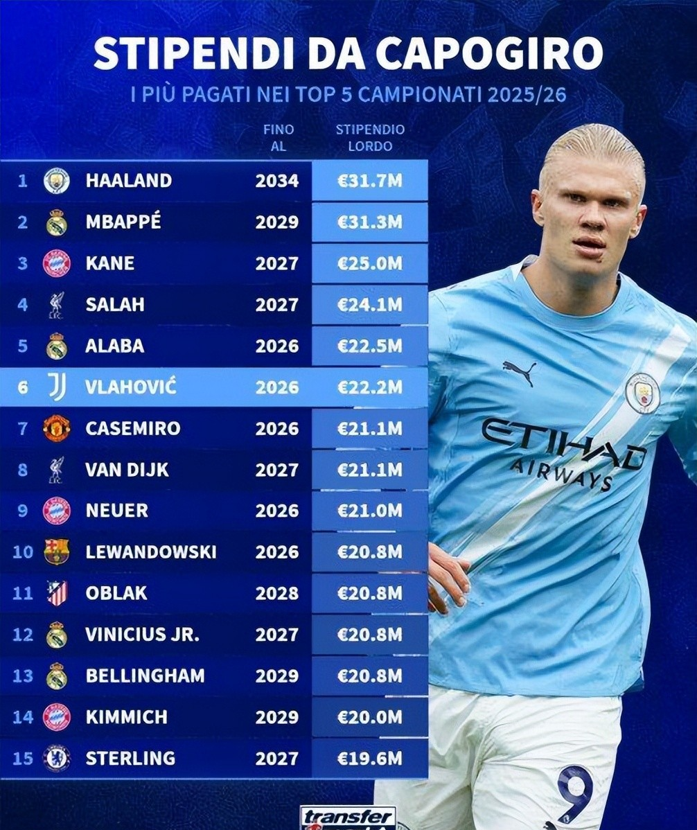 6、弗拉霍维奇,合约直至2026年,本赛季年薪2220万欧