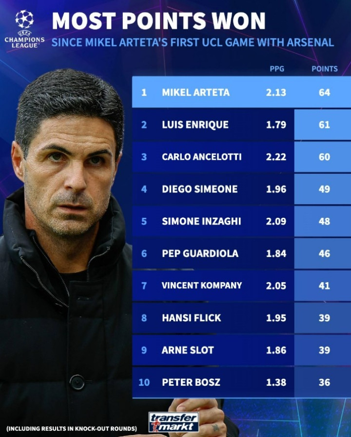 直播吧12月11日讯在本轮欧冠,阿森纳3-0大捷布鲁日,豪取6连胜。德转也清点了自阿尔特塔捏教阿森纳欧冠首秀以来,诸君王帅在欧冠同时积分榜(包括淘汰赛),具体如下(场均积分+总积分):