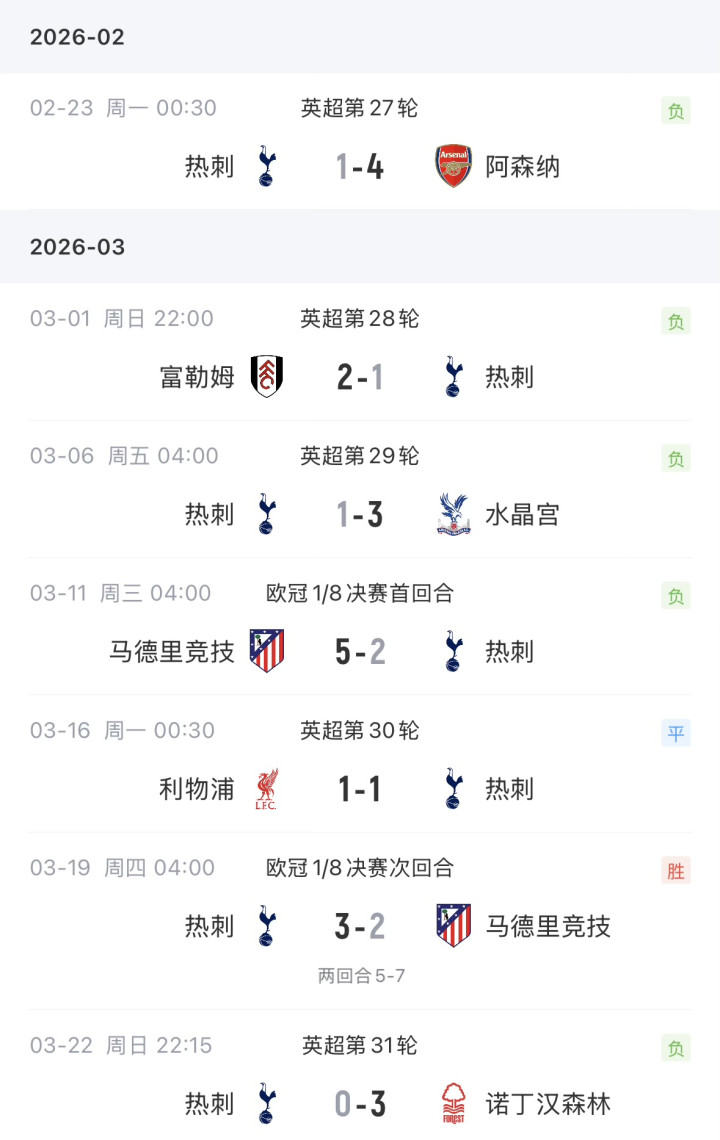 图多尔执教热刺各项赛事共踢了7场赛事 ,其中英超5场以及2场欧冠1/8总决赛 的赛事 ,英超1平4负,欧冠1/8总决赛 在首局 客场应战 2-5大败 给马竞之后,主场作战 3-2小胜已经留力稳妥晋级下一轮 的马竞,这也是图多尔执教热刺期间唯一的一场获胜 。