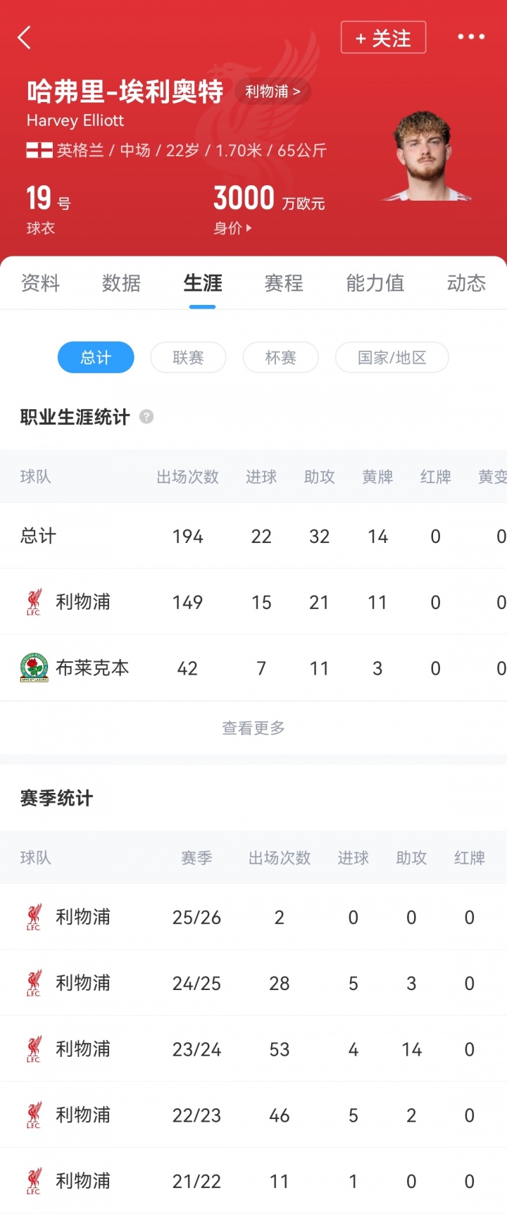 埃利奥特16岁被利物浦170万欧从富勒姆青训挖来,于今共为利物浦一线队出场149次,打入15球21助攻。