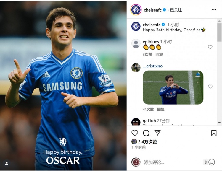 9月9日讯 今天是巴西中场奥斯卡的34岁生辰,老东家切尔西为他奉上道喜。