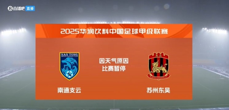 南通支云本轮中甲对阵苏州东吴,比赛进行到60多钟的时刻因天气原因暂停,据南通支云官方暗意,因雷暴天气,比赛暂停。当今,场上比分依然0-0平。